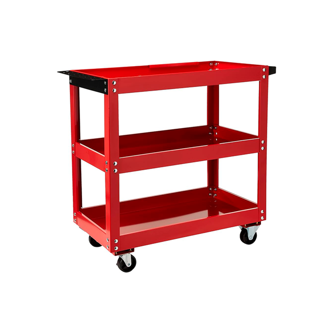 Este carro porta herramientas metálico color rojo cuenta con tres bandejas abiertas o niveles, diseñadas para almacenar de forma ordenada piezas, herramientas manuales, accesorios y objetos utilizados frecuentemente en talleres o casas. Está equipado con ruedas para movilidad, lo que permite trasladarlo fácilmente a cualquier punto dentro del área de trabajo.