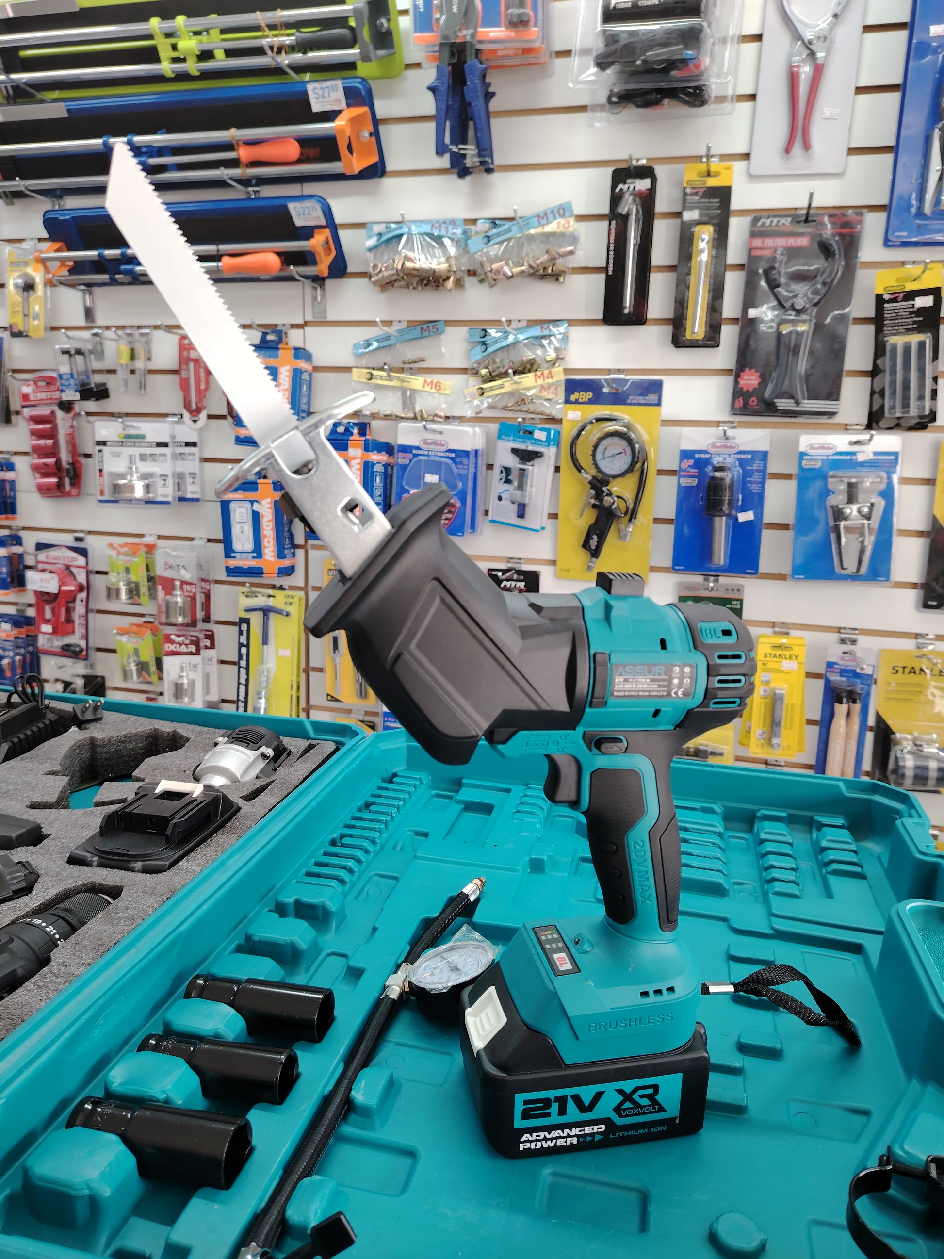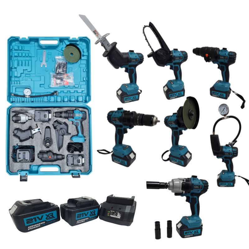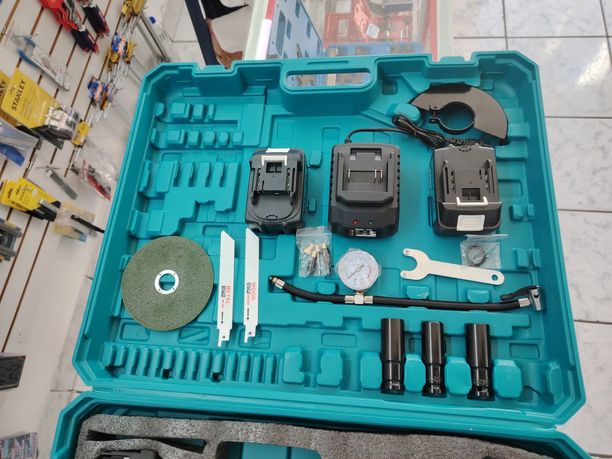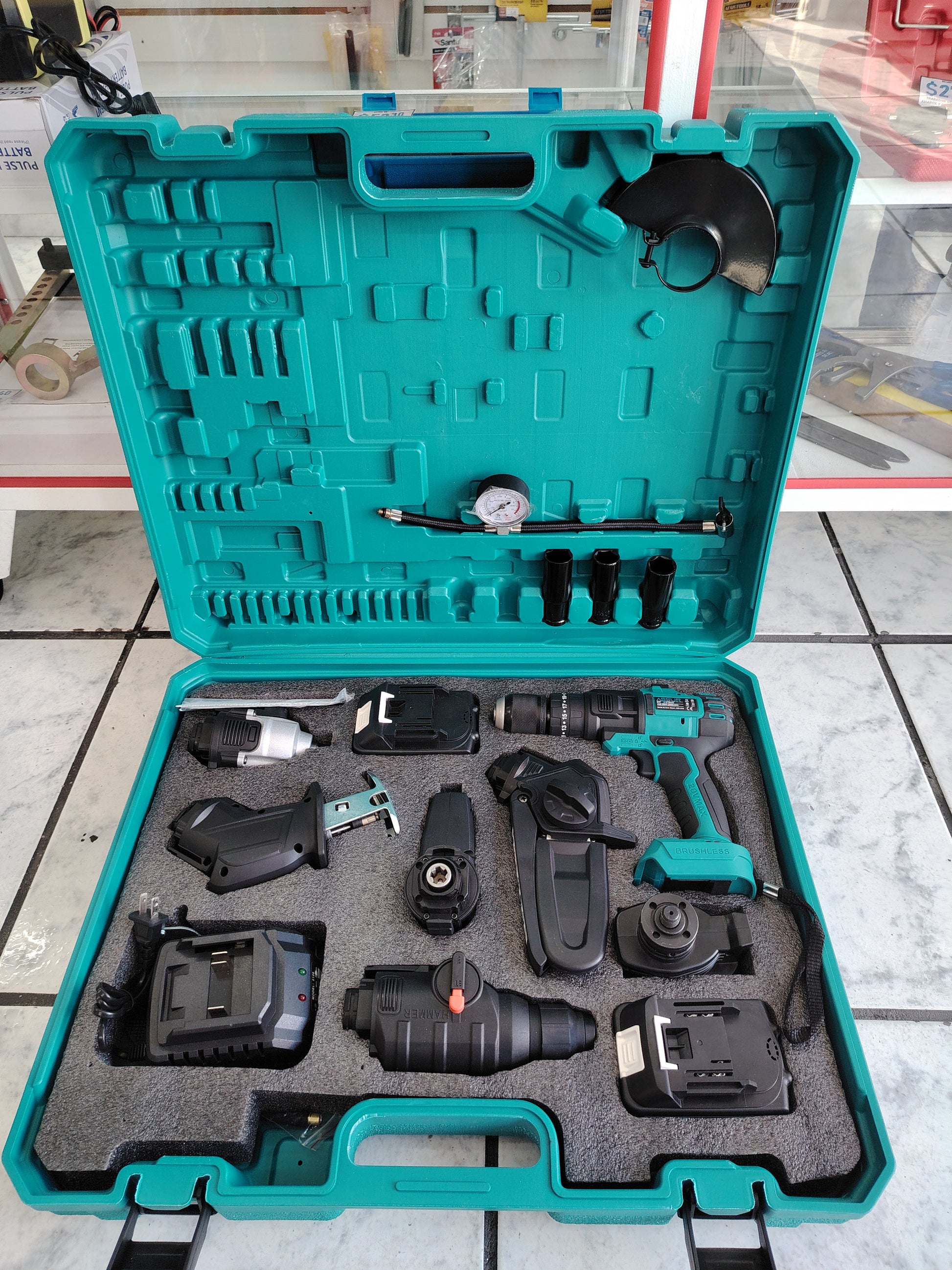 Funciones: Taladro percutor, llave de impacto, mini motosierra, rotomartillo, mini amoladora, sierra sable, mini compresor de aire